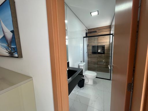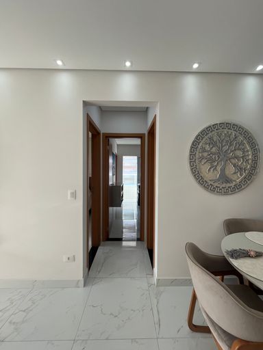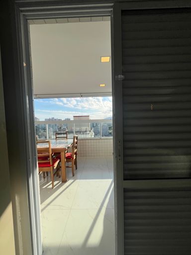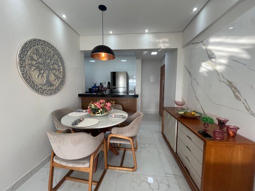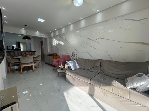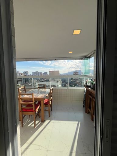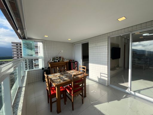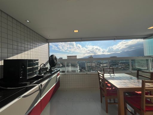 O apartamento conta com uma varanda ampla, já envidraçada, com churrasqueira à carvão, sala ampla integrada com a cozinha planejada.