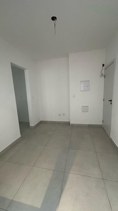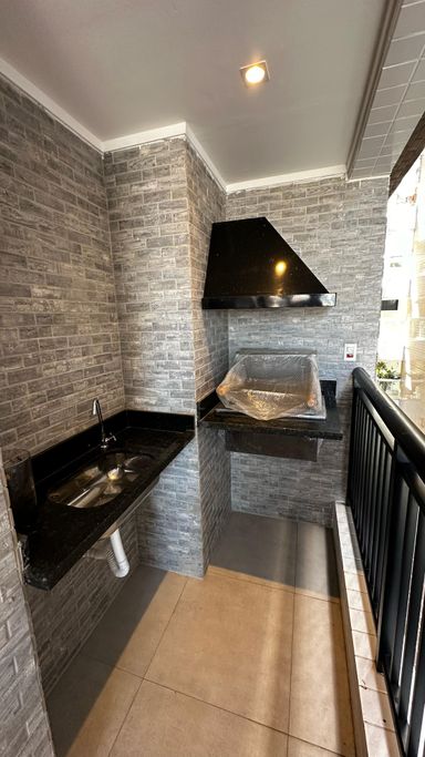 Sala, varanda com churrasqueira, cozinha, 1 banheiro social e área de serviço.