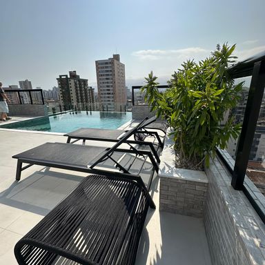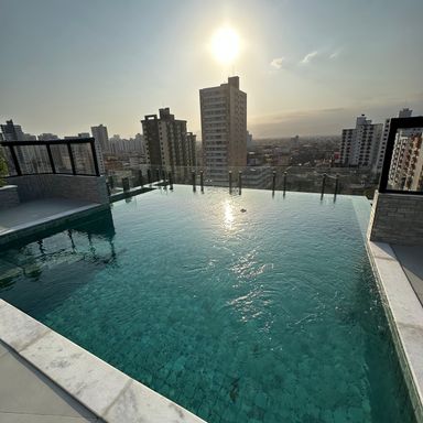 Lazer da cobertura: Piscina com borda infinita, sauna, espaço gourmet com churrasqueira e solarium.