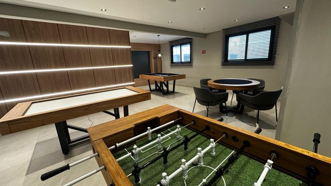Lazer no mezanino : academia, academia, salão de jogos, espaço kids, e espaço gourmet.