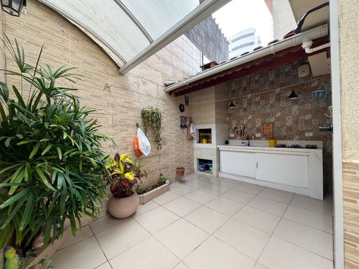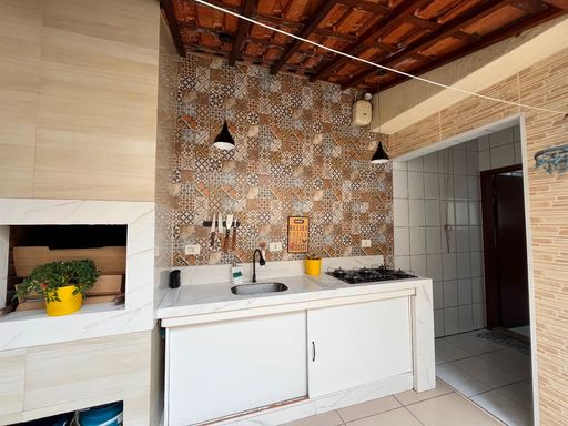 Na área gourmet temos churrasqueira à carvão, pia e coocktop num espaço bem decorado.